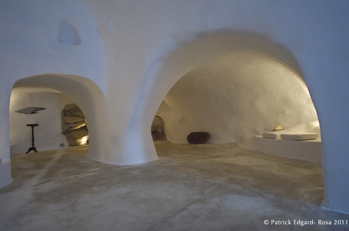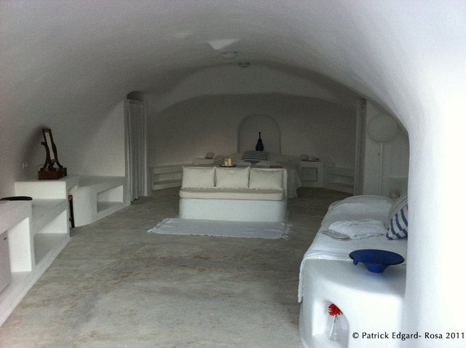 Nous garons le quad dans la cour du domaine, saisis d’éblouissement devant cet ensemble troglodytique rénové de façon extraordinaire, où le rose des bougainvilliers rivalise avec le bleu des portes et des dômes, et le blanc des enduits de façades : nous sommes à St Artemis, havre de fraîcheur : il s’agit d’ un ancien ermitage construit autour d’une chapelle : chaque cellule de pèlerin a été transformée en chambre décorée avec un goût parfait, dans un camaïeu de blanc, d’un confort luxueux et sobre à la fois, et d’une modernité acétique. Certaines scaftas ( cf article : Architecture et troglos à Santorin) plus spacieuses, servent de salle à manger ou de home cinéma troglo.