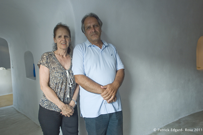 Nous avons découvert le site, dominé par l’église traditionnelle à coupole bleue, en passant sur la route qui longe la mer vers Oia, à l’Est de l’île. Un contrefort rocheux de lave badigeonné de chaux et percé de caves met notre curiosité en éveil et nous fait faire demi- tour malgré l’heure tardive.