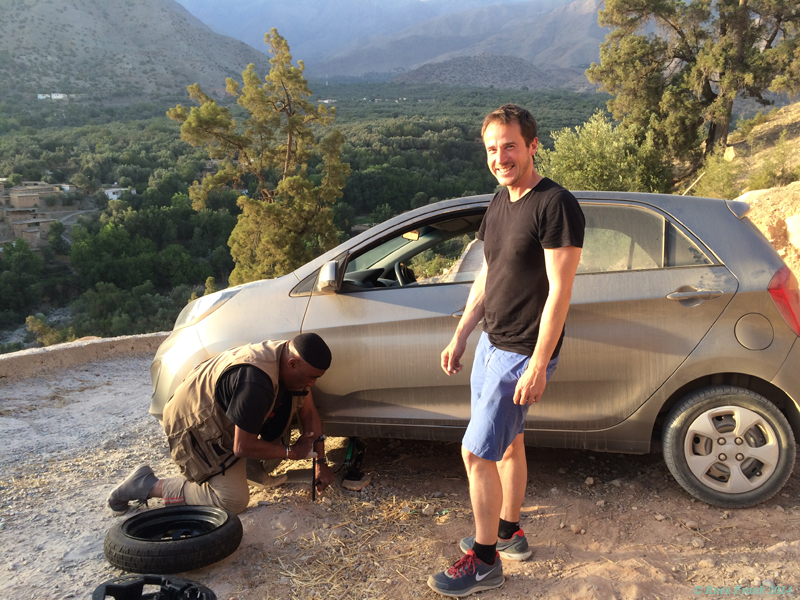 Quelque part au nord de Taroudant, en plein massif du Haut Atlas, les routes deviennent des pistes rocailleuses et serpentent de village en village. A trois cent mètres de notre destination, un pneu éclate…