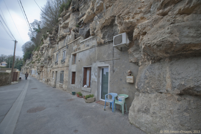 Voilà un village qui s'intéresse à ses troglos où, même sans le flair légendaire des Trogs, n'importe quel visiteur de passage peut trouver le site niché à flanc de coteau, cela grâce à des pancartes (et un grand parking) signalant le village troglodytique. Il faut applaudir à cette initiative, d'autant plus que la mairie s'est lancée dans une politique d'achat et de rénovation des troglos. La dernière en date : une ancienne discothèque, située dans les anciennes carrières, tout juste rénovée. La mairie a également racheté la Maison de la vigne et une maison particulière, afin d'y développer des activités artisanales. La rue située à flanc de coteau offre un charmant alignement de maisons troglodytiques basses à un seul niveau, aux portes et aux volets peints, avec de petits rideaux de dentelles désuets. On aperçoit à travers une fenêtre un très beau travail de poterie... Les jardinets sont situés de l'autre côté de la rue, et même en cette silencieuse et glaciale après-midi de dimanche de Pâques, la balade est charmante. Comme si le temps s'était arrêté à Gouvieux. Une image de carte postale d'autrefois...La végétation dégouline du coteau qui demande probablement à être quelque peu entretenu. Les Godviciens - c'est leur nom - possèdent un petit coin de paradis aux portes de Paris, avec vue sur une verte vallée. On adore!