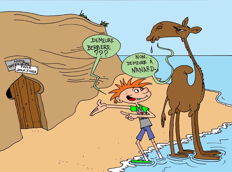 Alors là, P'tit Ch'nard, tu exagères ! à Bo Soun, pas très loin de la grotte de "Sidi Nanard", on ne trouve pas de chameaux... Les sentiers qui permettent de descendre sur la grève à marée basse sont trop escarpés pour nos amis les chameaux. Par contre, souvent on trouve des ânes, à marée basse. Pourquoi, d'après toi? Au nord de Bo Soun, à marée basse, la gente féminine descend ramasser moules et autres coquillages qui emplissent les nasses remontées à dos d'ânes. je te ramènerai des photos lors de mon prochain séjour, qui ne saurait tarder...