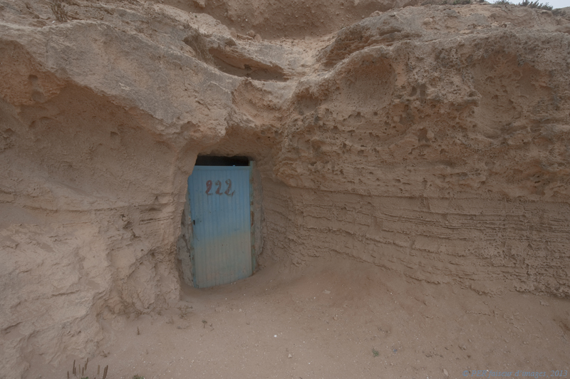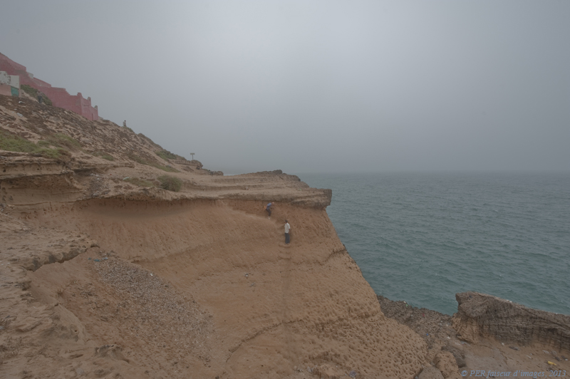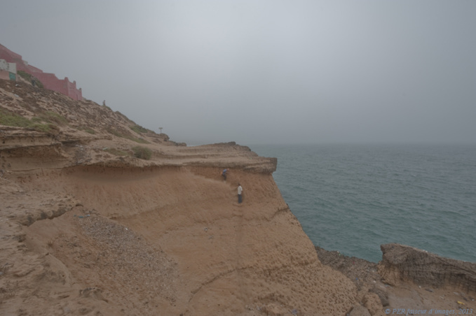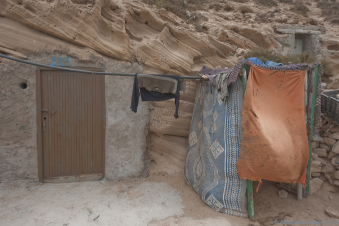 Nous quittons notre futur “fief” pour rejoindre celui du “Pape des Troglos”. Soit vous avez une mule, soit un 4X4, soit vous êtes un pilote expérimenté qui connait les pistes et les dunes comme sa poche. Notre pote Brahim, futur “régisseur” de notre domaine, nous conduit sans hésitation au village de pêcheurs.Il ne s'agit pas de grottes accrochées ça et là dans la falaise, mais d’un véritable agglomérat de cavités pratiquement toutes occupées par les pêcheurs. Une forte odeur de sardine flotte ans l'air... Le village est désert, tous les pêcheurs sont nichés dans des surplombs vertigineux : ils font leur marché en “ligne directe” 25 à 30 mètres plus bas : courbines, bars, dorades, mulets et raies les attendent quotidiennement. Impressionnant, comme cet escalier brut de brut, taillé dans la roche et qui dessert les points de pêche.