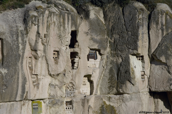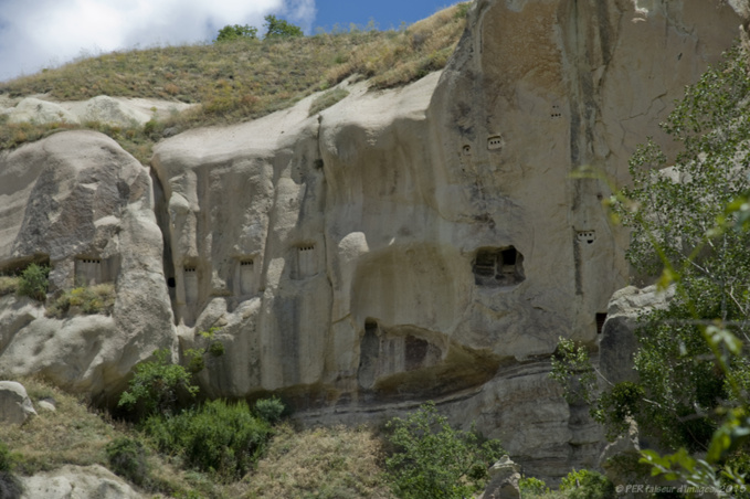 Les pigeonniers de Cappadoce sont généralement constitués de 3 ou 4 trous côte à côte ou de 2 lignes de trois trous qui obturent une surface de 5 à 10 mètres carrés. A suivre...