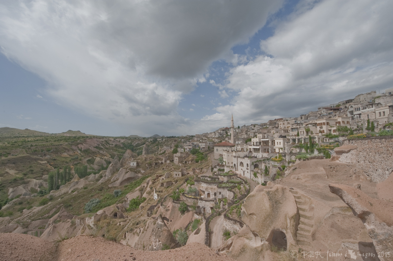 Le village d’Uchisar est situé sur un piton rocheux, d’où partent plusieurs vallées dont la grandiose vallée des pigeons. La maison d’Almut est située dans le bas du village, face à un paysage de cônes et de cheminées de fée roses et ocres percées de portes et fenêtres. Certaines ressemblent à des maisons au toit de chaume, véritables maisons de hobbits. D’autres s’élèvent vers le ciel comme des tours de gué. Toutes furent habitées par des communautés monastiques, puis souvent transformées en pigeonniers au 19ème siècle. Je choisis un pas de porte perdu dans les broussailles : je découvre une petite église monolithe, avec son abside et son dôme bien conservés .Elles sont des centaines cachées dans les falaises et dans les cheminées de fée.