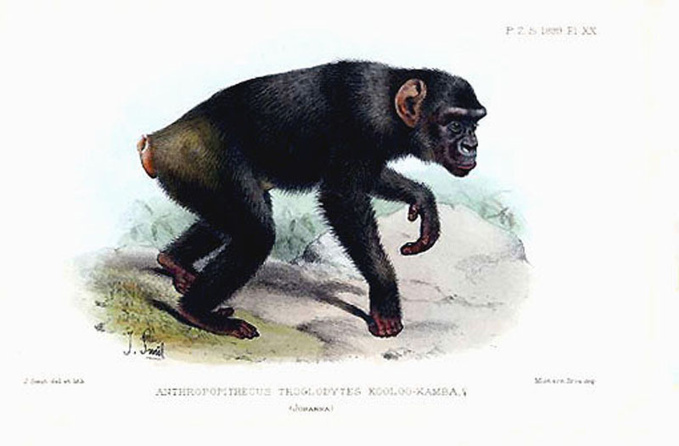 Les descriptions scientifiques affluent : Extrait tiré de Species des mammifères bimanes et quadrumanes par René-Primevère Lesson : Station normalement oblique sur les arbres, fréquemment verticale, plus rarement exécutée sur les quatre membres par terre. Système pileux généralement développé sur les parties éxtérieures du corps. Les individus ayant un larynx semblable à l’homme, mais privés de parole... Cette famille comprend les genres troglodytes... museau court, front fuyant, arcades sourcilières très saillantes... membres supérieurs de dimension moyenne atteignant le bas de la cuisse, ongles des pieds et des mains très aplatis. Mains larges et doigts courts, de la forme de ceux de l’homme. Point de queue.” Fin de citation.