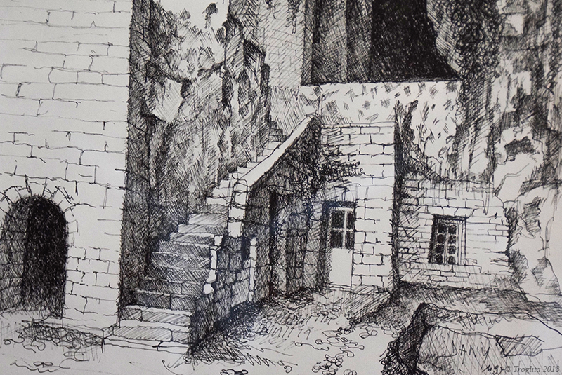 Pour« métamorphose»: je me suis rendue compte en dessinant les troglos qu’un visage d’homme est apparu.. ».