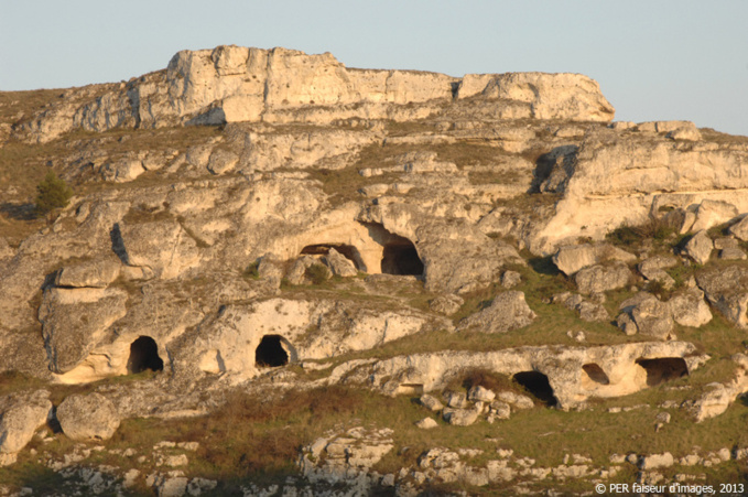 « C’est ainsi qu’à l’école, nous nous représentions l’Enfer de Dante. Je commençai moi aussi à descendre par un chemin muletier de cercle en cercle. Le sentier extrêmement étroit qui descendait en serpentant passait sur le toit des maisons, si on peut les appeler ainsi. Ce sont des grottes creusées dans la paroi d’argile durcie du ravin, chacune d’elle a une façade sur le devant, certaines sont même belles, avec de modestes ornements du XVIIIème siècle. Ces semblants de façades taillées verticalement dans le roc deviennent légèrement saillantes dans leur partie supérieure par suite de l’inclinaison de la côte : c’est par cet espace étroit entre les façades et la paroi que passe la route qui est en même temps un toit pour ceux qui habitent en dessous. Les portes étaient ouvertes à cause de la chaleur. Je regardais en passant et j’apercevais l’intérieur des grottes, qui ne voient le jour et ne reçoivent l’air que par la porte. Certaines n’en ont même pas, on y entre par le haut, au moyen de trappes et d’échelles