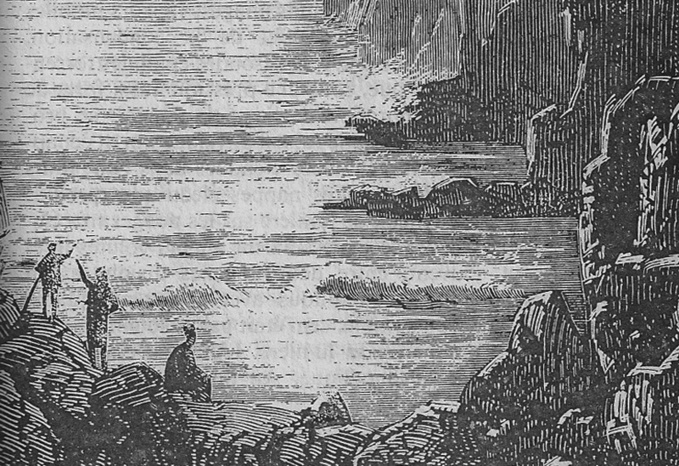 Une vaste nappe d'eau, le commencement d'un lac ou d'un océan, s'étendait au-delà des limites de la vue. Le rivage, largement échancré, offrait aux dernières ondulations des vagues un sable fin, doré, parsemé de ces petits coquillages où vécurent les premiers êtres de la création. Les flots s'y brisaient avec un murmure sonore particulier aux milieux clos et immenses. Une légère écume s'envolait au souffle d'un vent modéré, et quelques embruns m'arrivaient au visage. Sur cette grève légèrement inclinée, à cent toises environ de la lisière des vagues, venaient mourir les contreforts de rochers énormes qui montaient en s'évasant à une incommensurable hauteur. [...].