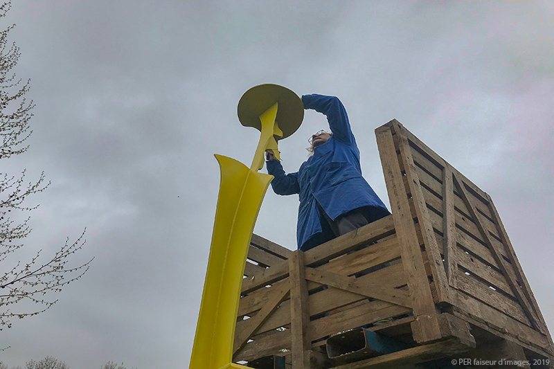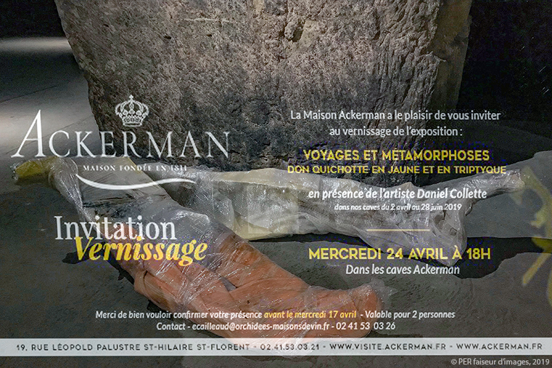 Don Quichotte en jaune et en triptyque poursuit sa quête. L'irrésistible hidalgo chevauche la pelouse et les millésimes de la prestigieuse Maison ACKERMAN du côté de Saumur.