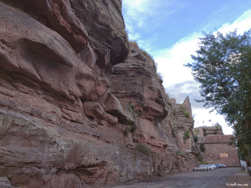 Le grès rose émerge ça et là au détour d’un virage, vision parfois surréaliste s’exposant au soleil perçant entre les arbres. Cette roche sédimentaire issue de l’agrégation et de la cimentation peut prendre des formes dures, à base de silice, de felspath et de micas. Il peut s´agir aussi de roches carbonatées. Couramment utilisé pour la construction, la sculpture, la fabrication de meules, le grès modèle aussi le paysage comme on peut le voir dans le Colorado (Monument Valley, Antelope Canyon…). Tout dépend de sa texture. Là nous sommes en Alsace, dans la France profonde.