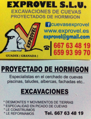 L’entreprise de Manuel, sise à Guadix, est spécialisée dans l’excavation, la projection de béton dans les caves (confortement) et de réhabilitation de façades. Elle creuse et agrandit également des caves existantes ou aménage des couloirs de communication. Les travaux concernent les caves d’habitation, les caves à vin et à champignons et la construction ou la réhabilitation de sites tels que Tropolis. L’excavation - l’argile et l’environnement géologique le permettent - peut être réalisée par une excavatrice ou comme la tradition le veut, à « mano ». Ces travaux nécessitent des études de terrain préalables et bien évidemment des piliers de béton pour consolider les parties affaiblies.