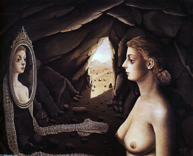 «Une grotte dans un désert jonché de pierres. Dans cette grotte un miroir 1900 auquel est appendue une dentelle serpentine. Devant ce miroir une jeune femme, buste nu (...) ce n'est pas à son reflet que s'adresse le regard pensif de la jeune femme, c'est ce reflet qui la contemple.» L'érotisme du peintre s'exprime à travers l'instant où le regard glisse de la dentelle à la pointe du sein de la jeune femme.”