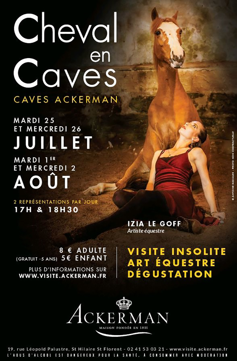 Créatrice et gérante de l’entreprise «Parad’Izia-K, Le Cheval Autrement», Izia Le Goff propose pour la seconde fois et pour cette cinquième édition, des numéros dans lesquels elle mise sur la confiance et la complicité construites au fil des années avec ses trois chevaux Radjah, Ockland et Pépito. Profitez de l’occasion pour visiter les caves monumentales de la maison Ackerman.