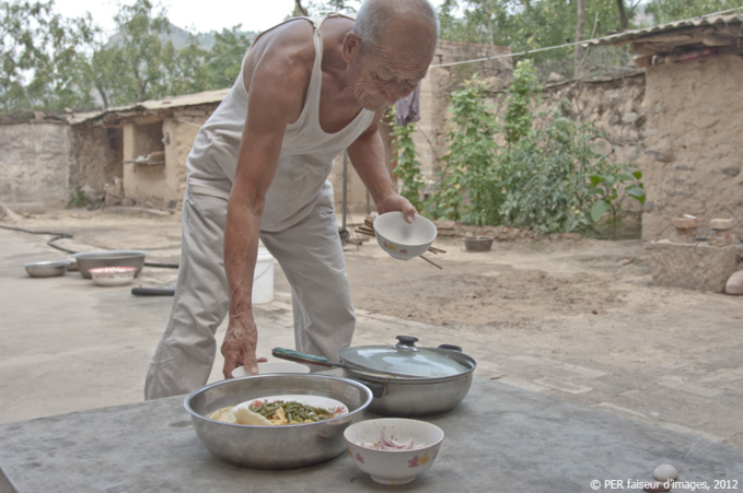 Le temps s’est toujours arrété à l’entrée du village qui n’a pas changé, émacié, comme le visage de Guo ru bin, toujours aussi inaltérable. Le progrès s’est infiltré, eau, electricité, portable et tablettes commencent à sévir. Mes roses trémières se portent à merveille; le fleuve s’écoule toujours aussi sauvagement et ma chambre (khong) est toujours aussi accueillante. Guo, toujours aussi présent et attentif est monté de Yanchuan (deux heures de route) spécialement pour l’occasion. Il vit à yanchuan, dans un immense appartement avec sa femme sa fille et son gendre, et joue son rôle de grand-père. Lors de la récolte du jujube tous remontent dans la ferme familiale qui retrouve comme tout le village une intense activité.