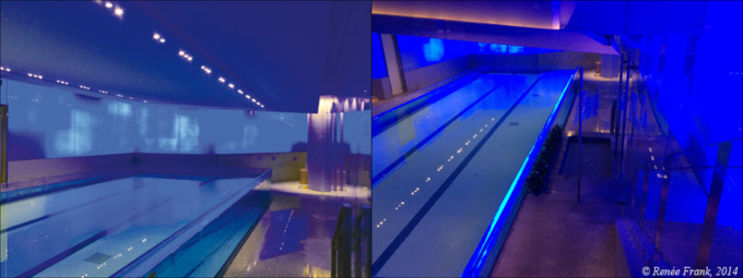 Et si je descends par l'ascenseur au sous-sol de l'hôtel, je découvre une élégante piscine souterraine, toute de bleue éclairée, dans son cadre de verre. Plus bas encore, un jardin enterré aux murs verticaux couverts de végétation mène vers le SPA au deuxième sous-sol. La modernité et les lumières inversent les repaires. Je ne sais plus où est le haut, où est le bas. Shanghai, ou l'expérience vertigineuse.