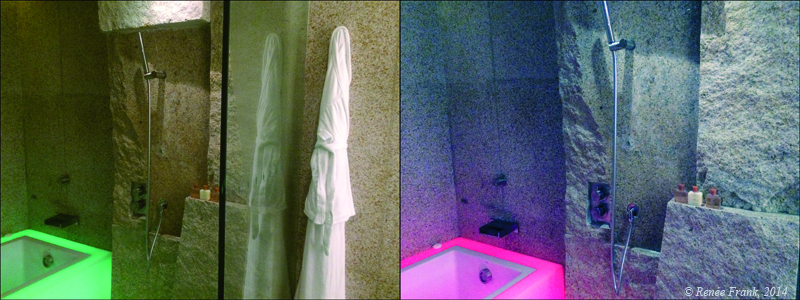 Ma baignoire change de couleur à volonté : bleue, verte, rouge, mais ce qui me plaît, ce sont les parois de ma salle de bain : on se croirait dans une carrière de pierre, là-haut au 25ème étage. Taillée à la serpe, elle me rappelle presque ma salle de bain troglo de Parnay. Une douche fraîche me régénère de la moiteur de l'été.