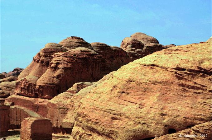 “Parcourir Pétra fut pour moi une joie immense, j'étais sous la stupéfaction et l'éblouissement de ce lieu magique, l'essentiel est d'ouvrir les yeux ....Pétra est un site fabuleux, un cadeau de la nature. Au fur et à mesure de ma visite j'étais sous le charme de ses multiples couleurs, parfois je pouvais apercevoir dans la roche des formes animalières, une empreinte du temps ....une manifestation de la grandeur divine, avec ses multiples facettes, la nature montre les choses telles qu'elles sont dans l'ordre de l'univers, une conception dans toute sa splendeur. Je ressentais une certaine faiblesse face à cette montagne Majestueuse ...”. J’ai demandé à Cléophée, l'auteur de ces lignes, de m’envoyer une de ses photos préférées. Celle qu’elle a choisie illustre tout à fait le propos d’Annie, gardienne de Pétra... Tout reste à découvrir et à faire.