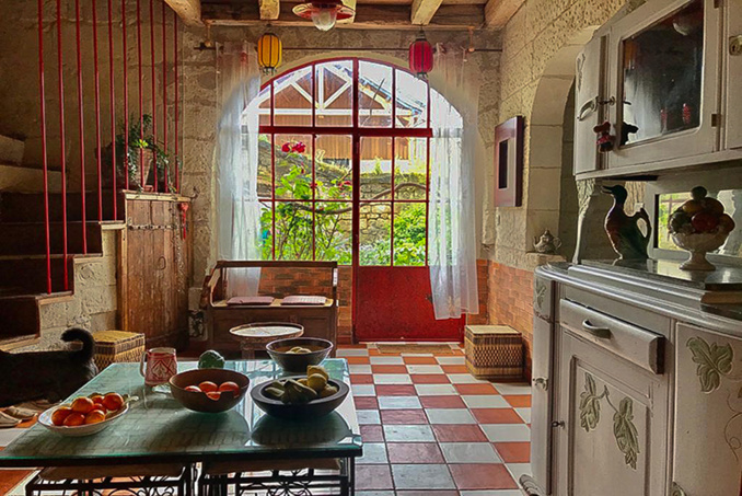 Au sol, dans l’entrée, des dalles de faïence remplacent le damier de vieux carreaux de ciment blanc et rouge hélas trop abîmés, et la salle à manger est aménagée avec un béton ciré. Petite erreur : nous oublions de laisser des goulettes comblées de galets entre les murs et le sol pour laisser respirer la pierre. Petite erreur de jeunesse… qui nous oblige à lutter contre l'humidité qui monte du sol.