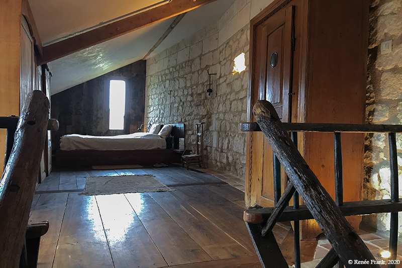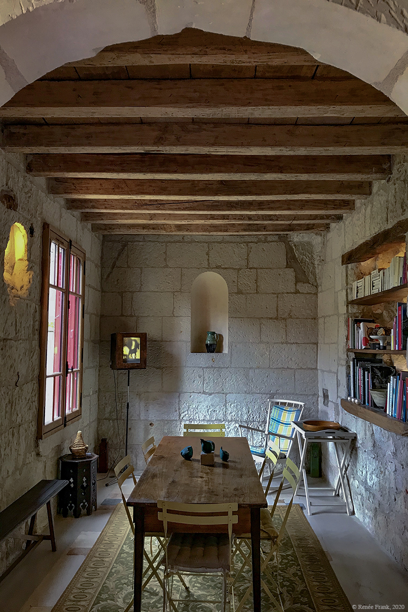 Ici, étonnement, le mur, d'abord monté en moellons, est appareillé avec soin dans sa partie supérieure, juste sous le demi toit. En effet, nous sommes au niveau du haut du coteau, et il faut soutenir la terre du terrain situé au-dessus, derrière la bâtisse. Un large plancher de châtaignier et des panneaux verticaux de bois sur les murs apportent une douceur qui contraste avec la rigueur minérale et isolent la mince façade de tuffeau. Nous installons de vieilles échelles comme rambardes. Notre chambre est comme une cabane dans les arbres qui bruisse sous la pluie et frémit dans le vent.