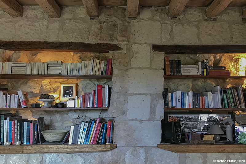 La salle à manger n’ayant que 3 mètres de profondeur, nous creusons le mur adossé au coteau pour élargir l’espace et monter des bibliothèques creusées dans le mur de moellons, avec des étagères de bois et d’ardoise.