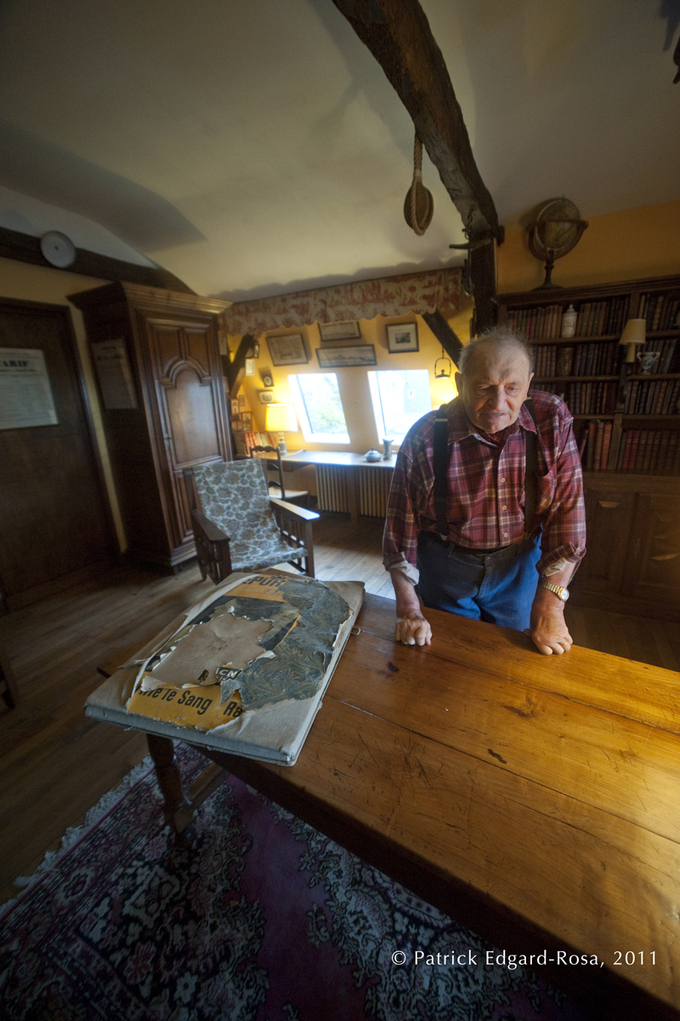 Jean, calme et imposant, nous fait asseoir et reste debout, en appui sur la table du salon, durant toute la première étape de ce chemin labyrintique qui nous amènera à découvrir ce temple du savoir. Encyclopédique. De la cave de tuffeau voûtée jusqu’au bureau de Jeanne et Camille, en passant par diverses strates de mémoires en voie de devenir, des reliefs de dents de requins “suçotées pour les nettoyer” aux vasques de porcelaines peintes, nous parvenons à “la bibliothèque” de Camille. Connaissez vous le Sacré? Même mes Nikons bruyants se figent de respect.