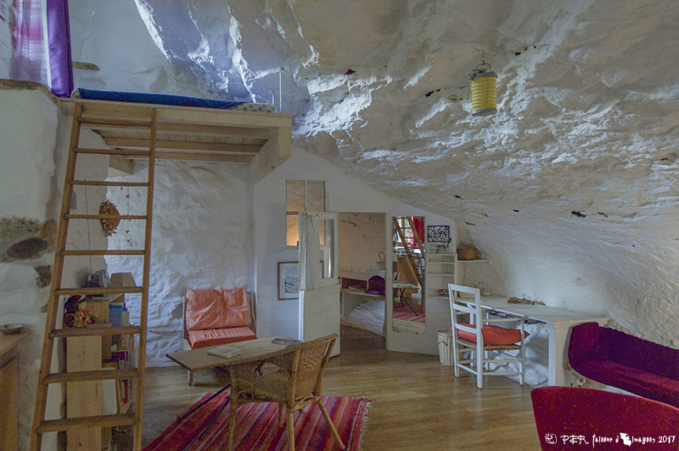 Nous arpentons cet abri de pierres sèches monté à l’aplomb de la falaise, dans la partie creusée la plus profonde : une grande pièce, coin cuisine et salon organisé autour d’un poêle à bois rivalise d’ensoleillement avec une chambre spacieuse. L’isolement voulu n’empêche pas le Dieu Internet d’officier quand bon nous semblera. Quelques câbles ombilicaux descendent discrètement le long de la paroi et distillent du sommet du plateau, eau, électricité, téléphone garanti. Pour le reste, égosillez à claire voix : vous interromprez les oiseaux nichés dans la végétation qui cerne une large terrasse ouverte de ce « p’tit coin de paradis ».