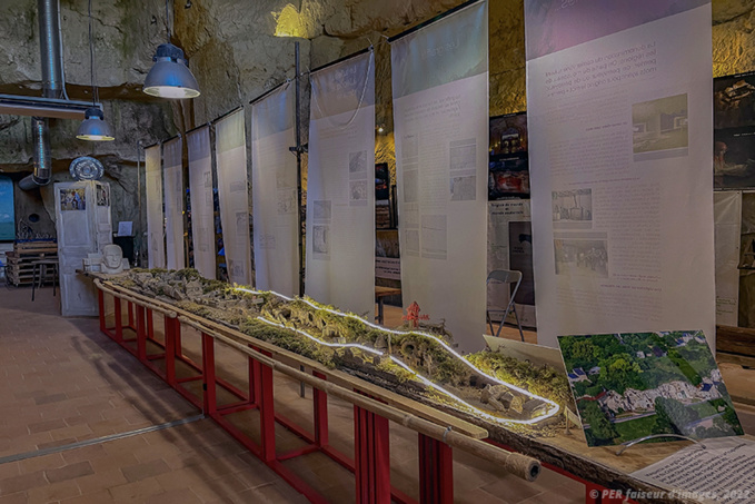Cette découverte du troglodytisme local se poursuivra à l'intérieur de la salle cathédrale que nous vous invitons à découvrir, en particulier à travers deux temps forts : l’exposition sur le tuffeau, conçue pour l’Écomusée du Véron (37) et actuellement en prêt à la Troglothèque, ainsi que la maquette de la rue historique du Château Gaillard réalisée par Jean Charles Mignot, habitant du village.
