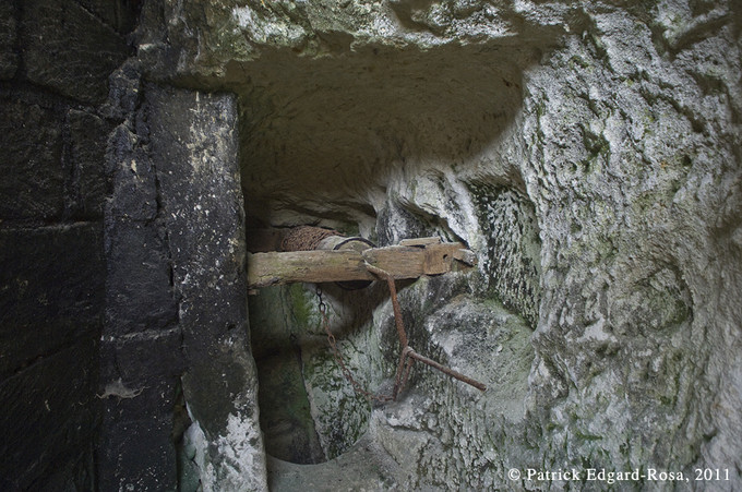 Je fixe le haut de mon échelle à l’aide de deux longues « sardines » plantées en biais dans le sol derrière les pierres appareillées du bord du puits. Afin de doubler la sécurité de l’ensemble j’assure cet ancrage par un cordage de nylon lui-même accroché au gond d’une ancienne porte de la cave. Et je teste rapidement le tout qui me semble parfaitement solide.