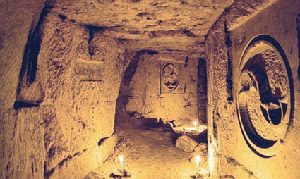 - Espace construit, enterré ou non, ménagé sous une église, ou sous le chœur d'une église, pour y conserver des corps de martyrs, des reliques.
