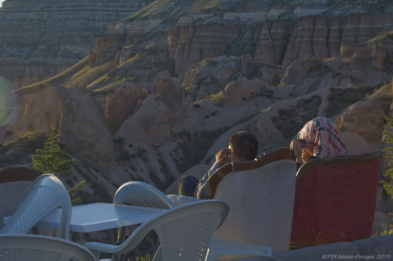 Nous franchissons donc allègrement la barrière payante à 7 heures du soir. Le coucher est programmé à 20h12 en ce 30 juin. Nous sommes parmi les premiers spectateurs à arriver, ce qui nous permet de choisir nos fauteuils comme au spectacle, au 1er rang, alignés le long de la falaise. Avec un verre de jus d’orange pressée et un thé, nous voici parés pour attendre cet événement historique. Devant nous, une vallée composée de cônes de tuf roses, qui commence déjà à s’assombrir. D’ici le coucher du soleil, elle devrait être éteinte, à moins qu’un éclairage magique ne vienne raviver ses couleurs se préparant déjà pour la nuit