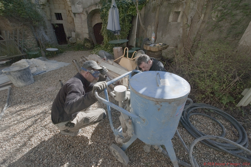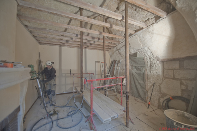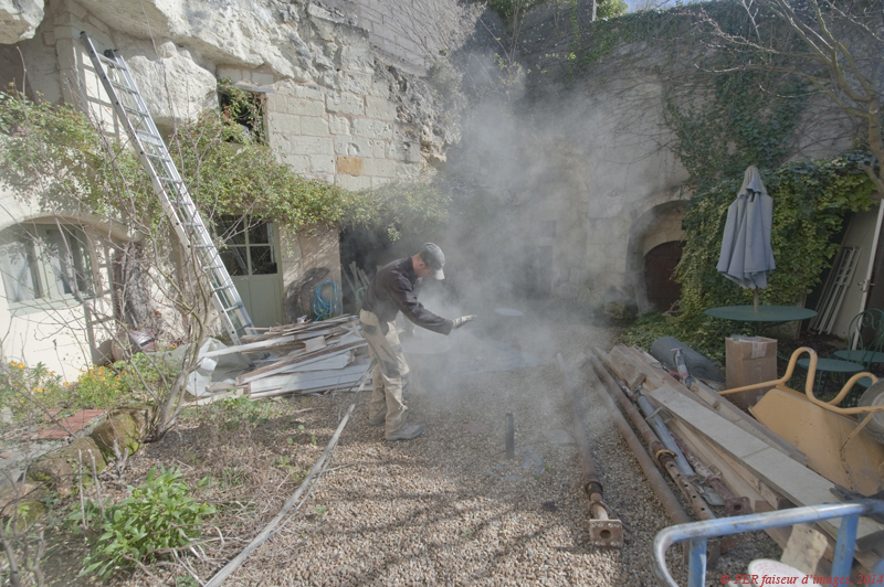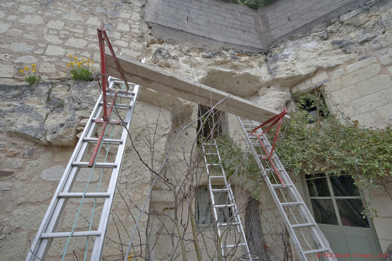 Grégoire Pierson s’empare des lieux avec son équipe, après acceptation du devis, soit un total TTC de 8 285,00 euros (glurps!). Quand on aime, on ne compte pas, surtout dans un lieu ouvert à la location… on en profite pour purger et nettoyer la façade extérieure, poser quelques broches, par-ci par-là y compris dans deux petites pièces troglos situées au premier étage.