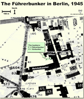 Une partie des pièces du bunker étaient occupaient par la garde personnelle du Führer,d'autres avaient été mises à la disposition de civils cherchant refuge. Ailleurs était installé un hôpital où étaient accueillis plus d 300 blessés, pour la plupart gravement atteints. Ils étaient soignés par 2 médecins totalement débordés, assistés par quelques infirmières et aide soignantes. Tandis que les uns opéraient des patients sur des tables couvertes de sang, les autres évacuaient les cadavres ou portaient jusqu'à la sortie du bunker de grandes bassines pleines de membres amputés, en se frayant un chemin à travers la foule qui encombrait les couloirs.