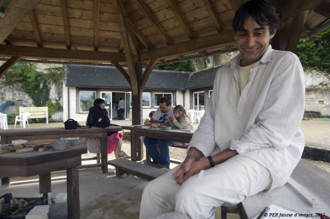 David est tailleur de pierre à Saint Germain sur Vienne (37) . "La roche est le squelette de l'habitat" me dit-il, c'est elle qui en définit la structure, la décoration... Il existe plusieurs qualités de tuffeau, de la pierre friable à la pierre moins tendre. Plusieurs couleurs, plus ou moins colorées, plus ou moins remplies d'imperfections (les "chnards": silex ou coquillages). Cela va dépendre de sa localisation, sa profondeur, sa datation... Ne soyons pas géologue, ni même architecte , quoiqu'en en troglo, un tailleur de pierre, au fond, cela ressemble bien à un mélange de tout cela... avec des mains qui expriment sa pensée!