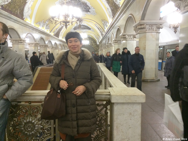 Je descends à Krasnopresnenskaya pour admirer les mosaïques et la grande fresque au fond de la galerie. Plus loin, à Novoslobodskaya ce sont 32 vitraux polychromes qui retracent l’histoire du socialisme soviétique. Plus loin, les décors de porcelaine rivalisent avec la céramique ou le stuc qui décorent les vestibules de chaque station.
