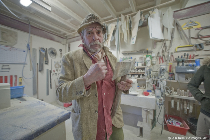 Son apprenti est en train de déblayer l’entrée de son hall d’exposition en cave : quelques mètres cubes de terre se sont avachis à l’entrée du troglo, sans gravité aucune. Et c’est avec flegme qu’il reçoit toute l’équipe de tournage accompagnée par les Trogs en goguette.