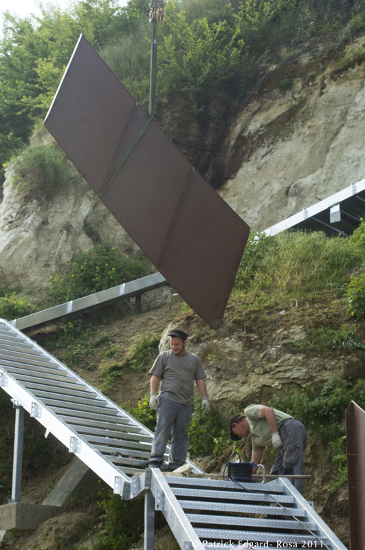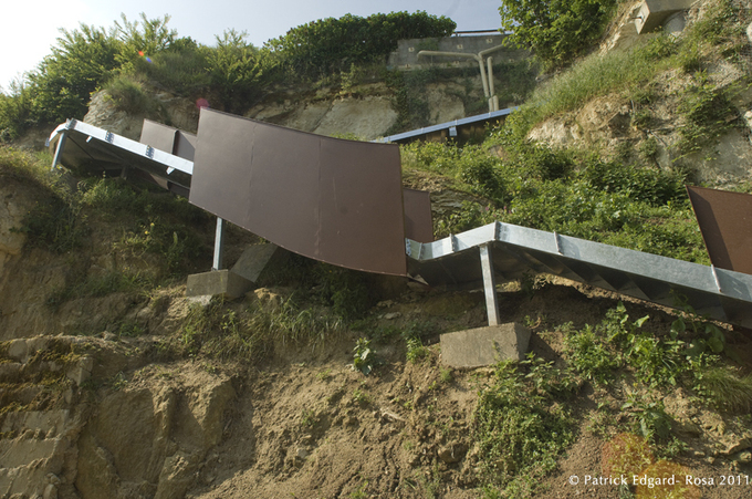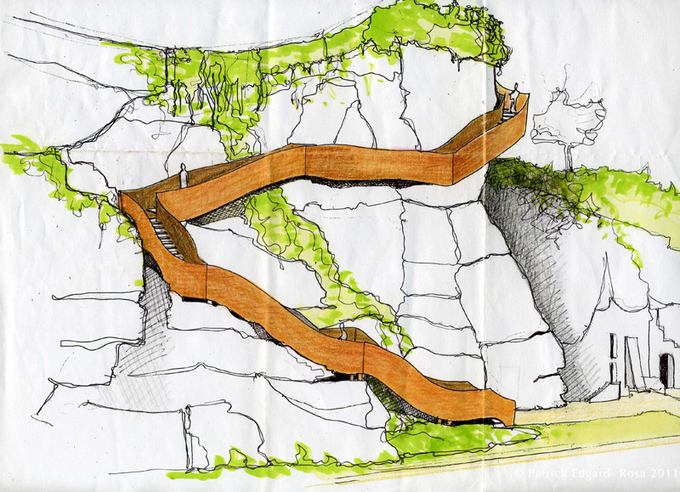 Pour le maire de la commune, Jackie Goulet, le projet s’inscrit dans la continuité des objectifs entrepris sur tout le village d’Art : la consolidation du coteau menée de front avec un vaste projet à caractère touristique. Un escalier existait à cet endroit, maintenant enfoui dans la mémoire du village. Jackie Goulet lui redonne une seconde vie et confie le fruit de son imagination à l’architecte Bruno Duquoc, déjà bien au fait du terrain : “l’idée de la grande lame d'acier rouillé, serpentant le long du coteau m’est venue d'un voyage dans le Lubéron, où ce matériau a été utilisé, pour aménager le « sentier des ocres » de Roussillon.” Facile à imaginer, encore faut-il trouver le financement et relever le défi technique. Deux marches à franchir.