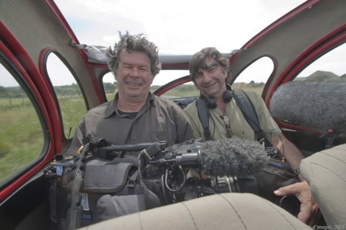 “Une fois les tournages "au sol" terminés, nous avons encore une journée entière (et rien qu'une) de tournage des images aériennes, depuis un hélicoptère, avec un système de caméra cinéflex. Dans l'hélicoptère, il y a un pilote, un caméraman spécialisé dans l'utilisation de ce matériel, et un réalisateur (là c'était Fred), pour guider, suggérer et vérifier les images tournées. Nous filmons depuis les airs tous les lieux où nous étions au sol, mais aussi d'autres sites qui nous permettront de raconter la région, et de nous déplacer d'une séquence à l'autre dans le film.”