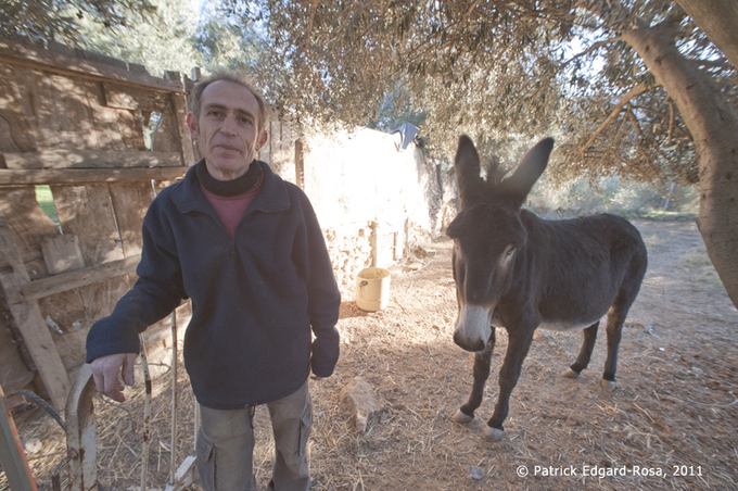Natif de Gorafe, Ignacio avait hérité d’une huerta d’oliviers, située aux abords immédiats du village, en contrebas, à proximité du cours d’eau. Cette annexe, ce repaire m’a permis de découvrir un autre aspect du personnage : son amour pour son village et sa terre, cette terre qui distille quelques légumes et fruits, mais donne la possibilité aussi à tout propriétaire d’avoir sa propre production d’huile. On ne peut parler de l’Andalousie sans évoquer ces majestueux et infinis paysages couverts d’oliviers. Je découvre la huerta d’Ignacio avec ravissement et patiemment, il me raconte cette relation inscrite dans les générations avec l’olivier. Puis il me guide vers une parcelle ou trois ânes accourent vers nous et que nombre de poules évitent bruyamment. Il cueille quelques olives prêtes à être récoltées, fière de leur aspect : « c’est ça le résultat de l’engrais naturel. Ici tout est nature de chez nature ! ». Enfin il nous emmène voir un petit bout de coteau, et le désignant, nous confie son rêve à venir : y construire de ses propres mains une belle cueva pour sa femme et lui, juste à côté de son champ d’olivier.