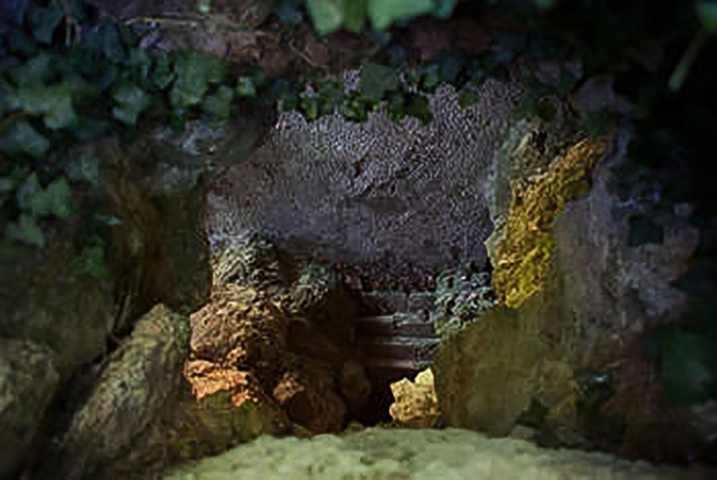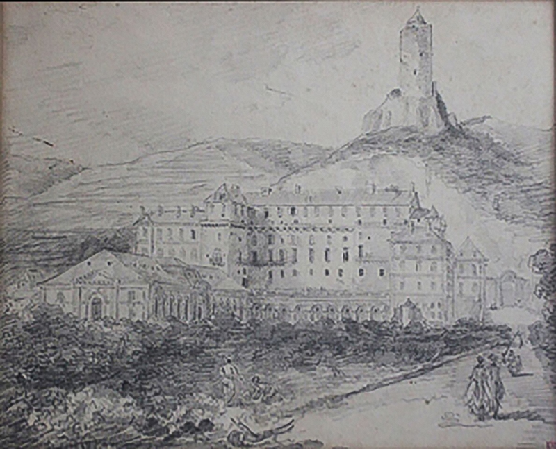 L’artiste a tansformé le donjon du XIIe siècle qui domine le château, demeure des La Rochefoucauld, en ruine pittoresque. Il y crée un jardin paysager, dit le Jardin anglais, composé du donjon, d’une cascade artificielle de 22 mètres de hauteur et de nombreuses grottes incrustées de coquillages.
