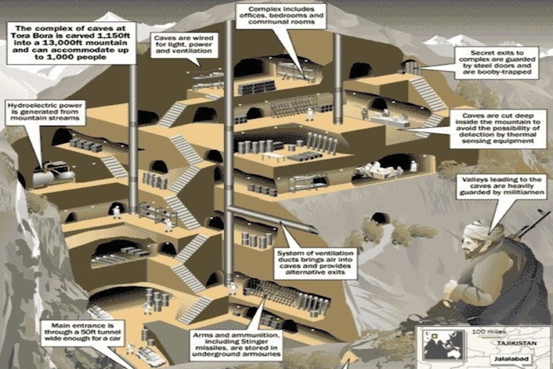 Ce cher Ben Laden « connaissait l’endroit depuis ses années de lutte contre les Soviétiques. Il y avait fait aménager des centaines de grottes, certaines creusées de plusieurs dizaines de mètres sous la montagne dans l’anticipation de bombardements. Les bulldozers utilisés provenaient de la compagnie de construction saoudienne de son milliardaire de père et la légende veut qu’Oussama Ben Laden lui-même se soit mis à leurs commandes, bravant les chemins escarpés. Equipées de systèmes de ventilation, ces grottes étaient reliées entre elles par des tunnels, permettant à leurs occupants de se déplacer sans être vus. »