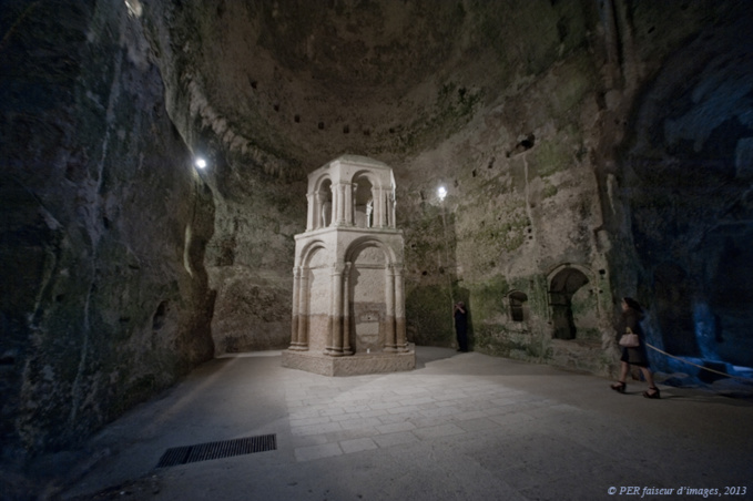 C’est le sommet de l’architecture soustractive française qui s’offre à votre regard. Les hypothèses vont bon train quant à ses origines, peut-être un très ancien sanctuaire mithraïque, transformé par les premières communautés chrétiennes, agrandi au 8ème siècle (?)… L’histoire demeure atypique et méconnue. Au 12ème siècle, l’édifice sous l’impulsion de moines bénédictins prend sa configuration actuelle et devient une étape sur la route de Saint Jacques de Compostelle. En 1794, elle est transformée en fabrique de salpêtre (vive la Révolution et la poudre à canon!) pour terminer en ossuaire municipal!