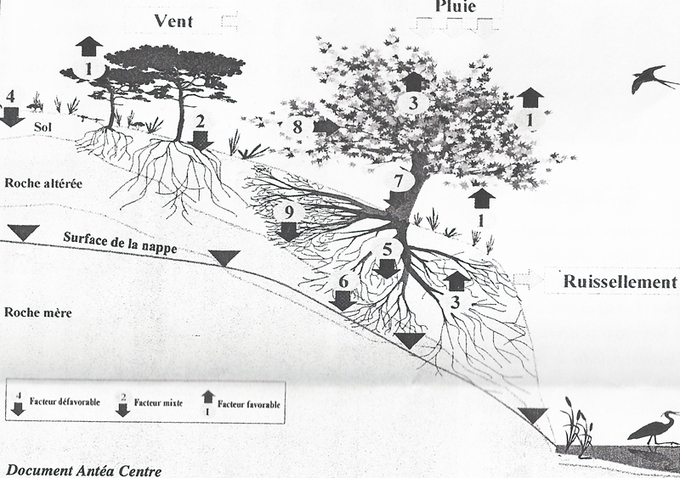 Grâce aux racines, les arbres recueillent l'eau du sol dispersée dans l'atmosphère ; cela abaisse les pressions interstitielles dans le sol.