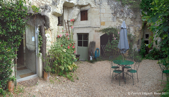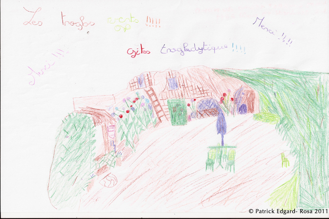 Lucas n’a pas emprunté l’appareil numérique de son père, mais a immortalisé le lieu à sa manière. Il s’est planté dans le jardin et m’a offert, avec un ravissant sourire, et du haut de ses onze ans tous neufs, sa vision des troglos.