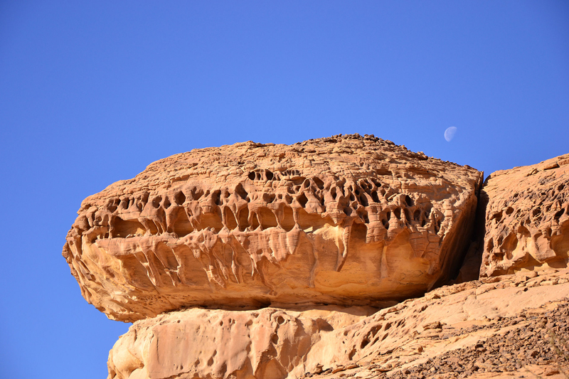 Les blocs de grès rouge au milieu du désert offrent un paysage fantastique, même si l'accès n'est pas aussi spectaculaire qu'à Petra protégé par un étroit défilé.