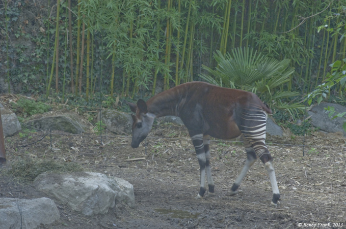 Mais revenons à nos moutons. Les okapis font partie de l’ordre des artiodactyles (qui sont des mammifères à sabots, au nombre de doigts pairs) et de la famille des giraffidés. D’ailleurs, si vous imaginez une tête et un cou de girafe avec un corps de zèbre, vous commencez à percevoir à quoi un okapi peut bien ressembler. En fait, son nom vient de la description qu’en faisaient les pygmées Mbuti : à cause des rayures blanches sur sa croupe brune, il ressemble à « un arbre éraflé par des flèches ». Il ne fut pas baptisé d’après le nom d’un certain explorateur nommé Okapia, comme l’a écrit un célèbre journal local… L’explorateur qui a découvert les okapis au début du XXème siècle s’appelait Sir Harry John Stone (encore un prénom royal). L’okapi vit jusqu’à 30 ans, mesure 1,80m au garrot, pèse de 200 à 270 kilos et sa gestation dure 15 mois. Il est herbivore et s’avère inoffensif, même si ses réactions peuvent être inattendues (se méfier des coups de sabot !)