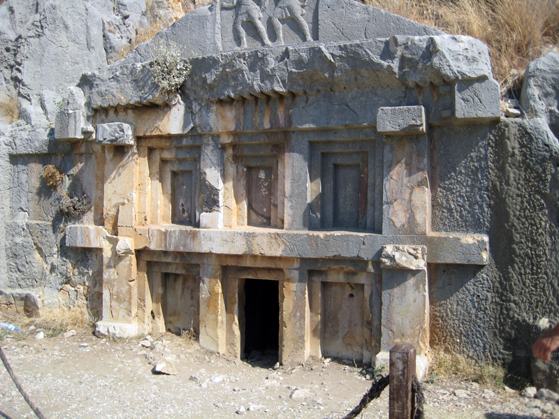 Myra est surtout connue pour sa nécropole constituée de tombeaux rupestres percés dans la falaise, que l'on date du 5ème siècle av. J.-C. Les tombeaux sont décorés d'une représentation soit du mort, soit de ses parents ou encore de ses amis. Le plus connu est dénommé "Tombeau du lion" . Il était encore peint de rouge, de bleu et de jaune lorsqu'il fut décrit par le voyageur Charles Fellows en 1840.