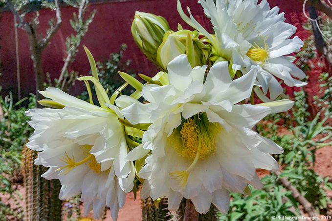Lorsqu’elles visitent ces plantes, les chauves-souris volent en groupes d’une douzaine ou plus. Elles se positionnent au-dessus de la fleur, lèchent le nectar avec leur langue et couvrent leurs museaux de pollen qu’elles transportent ensuite de cactus en cactus. Bien que ceux-ci soient aussi visités par d’autres pollinisateurs, leur évolution a fait d’eux des « plantes à chauves-souris », ce qui semble indiquer que le nombre de chauves-souris à pollen était il y a des centaines de milliers d’années beaucoup plus important qu’aujourd’hui.