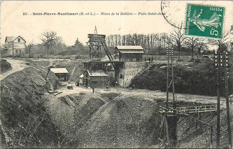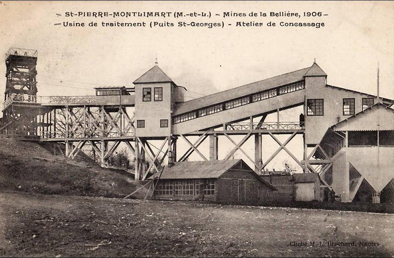 En 1905, les Mines de la Bellière ouvrent et impactent l’économie de la commune. La population augmente (1758 personnes en 1906, 2526 personnes en 1911) et de nombreuses constructions et infrastructures apparaissent : bâtiments, châteaux d’eau, éclairage public, fontaine, trottoirs, bureau de poste… La mine s’étend sur un quart de la commune. A la Belle Époque en 1912, 750 mineurs travaillaient dans les 75 km de galeries creusées et sortaient 2 à 3 kg d’or par jour. Ils étaient payés 3 fois plus que les agriculteurs des Mauges et partaient à la retraite à 55 ans. Aujourd’hui, ce sont beaucoup de noms de rues, écoles, commerces, association, rivière, lieux-dits font référence à l’histoire de Saint-Pierre-Montlimart, son or et ses mines !