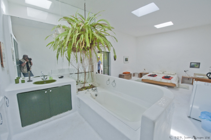 Notre chambre s’ouvre aussi sur le patio par une porte unique, sans fenêtre. Pourtant, à l’intérieur, la vaste pièce est lumineuse. Une lumière zénithale zébrée par les ombres mouvantes des branches de l’eucalyptus éclaire les murs chaulés de blanc. Trois carrés ouverts sur le ciel, comme une œuvre de l’artiste James Turrell : une idée de César Manrique qui est passé par là. Nous ne pouvions rêver mieux pour camp de base de notre exploration de l’île. Du plafond, une suspension imposante de fougère déferle sur une large baignoire ouverte sur la chambre. Un espace moderne, lumineux et sobre comme je les aime. La sérénité est au rendez-vous. Nous faisons connaissance avec José, le maître des lieux, dont la voix indolente et le physique imposant nous rappelle nos amis cubains. Les Canariens ont beaucoup en commun avec les îliens de l’autre côté de l’Océan.