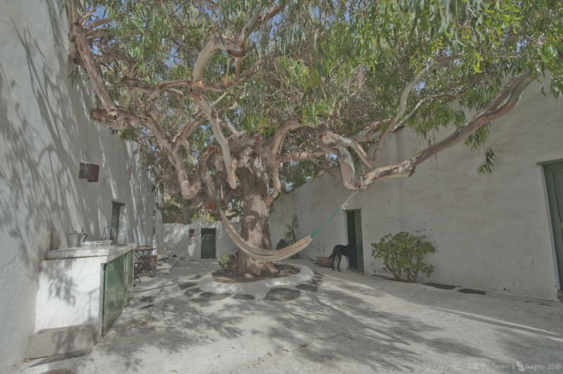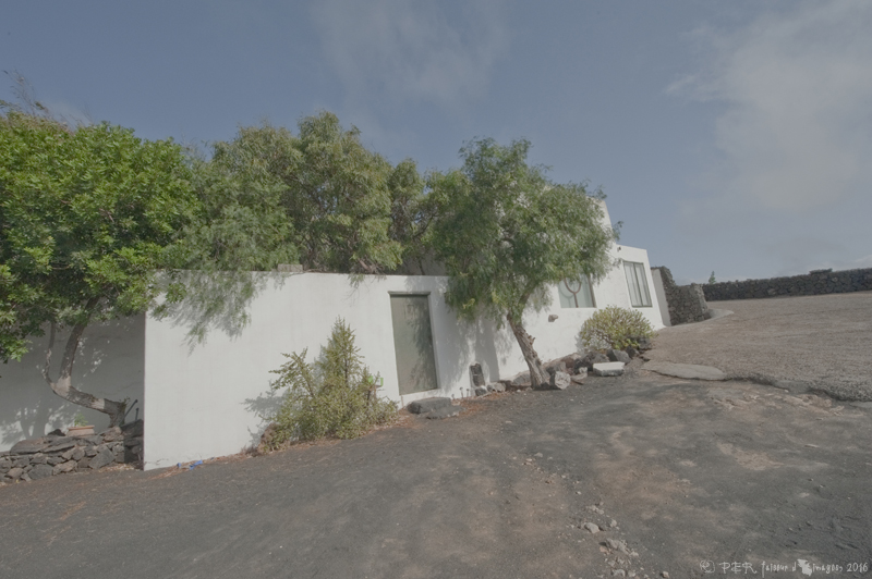 De l’extérieur, la ferme ressemble aux autres maisons de paysans des villages blancs alentour, aux fenêtres et volets peints en vert avec un toit plat en terrasse. On y pénètre par une porte qui donne sur une cour intérieure occupée par l’arbre autour duquel a été construite la maison. Un hamac se balance aux branches et vous invite à la rêverie. A l’extérieur, le vent balaye les pans de la montagne et les paysages de coulées de lave à la fois inhospitaliers et grandioses. On se sent immédiatement à l’abri des forces naturelles qui ont forgé cette île aride au climat presque hostile à l’homme. Les pièces de vie sont distribuées autour de la cour, tournées vers l’intérieur comme dans les kasbah berbères.